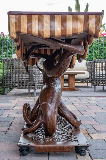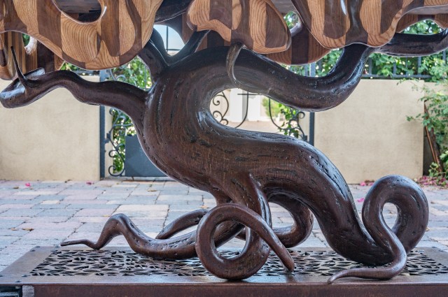 That ability to “fix” his sculptures came in handy last year after a hit-and-run driver damaged a large metal-and-river-rock swimming dragon sculpture that guards the front yard of the artist’s Scottsdale residence. McCallister was able to reconstruct the crushed and contorted gabion-style segments of the Viking-influenced sea monster and reinstall it in its prominent spot near the street, where its serpentine humps, spiked tail, sharp scales and large mouth brimming with pointed steel teeth capture the attention of passersby.